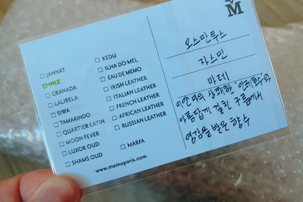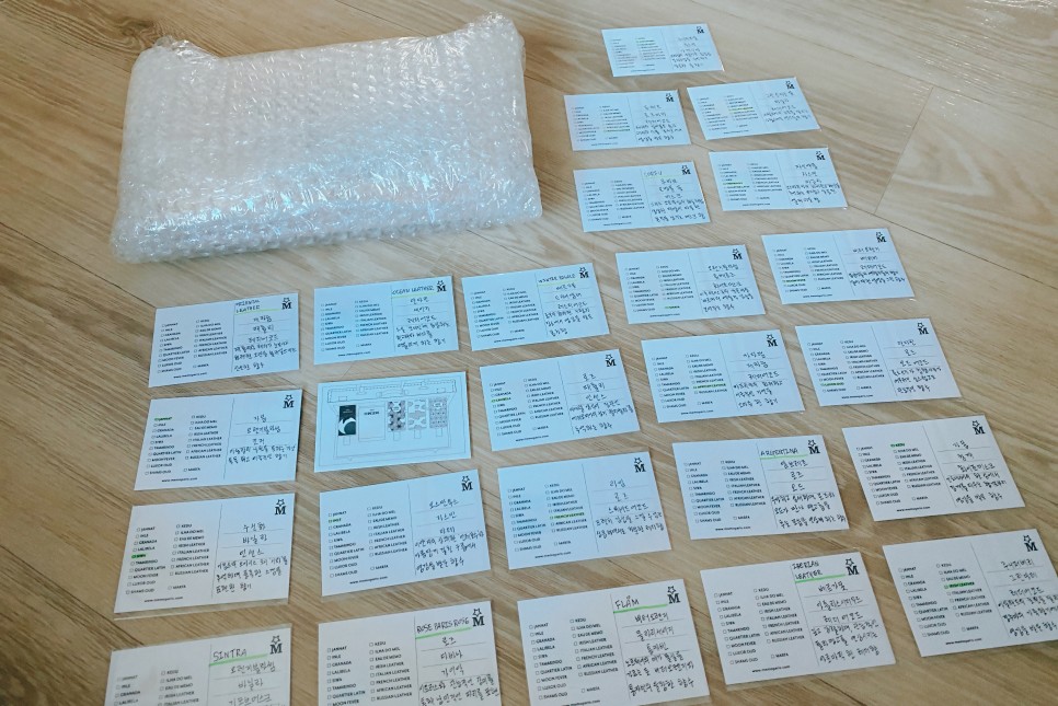 꼼꼼하게 패킹된 메모 디스커버리 키트와 손글씨로 표기된 시향지를 25장이나 동봉해 주셔서 놀랐다.
